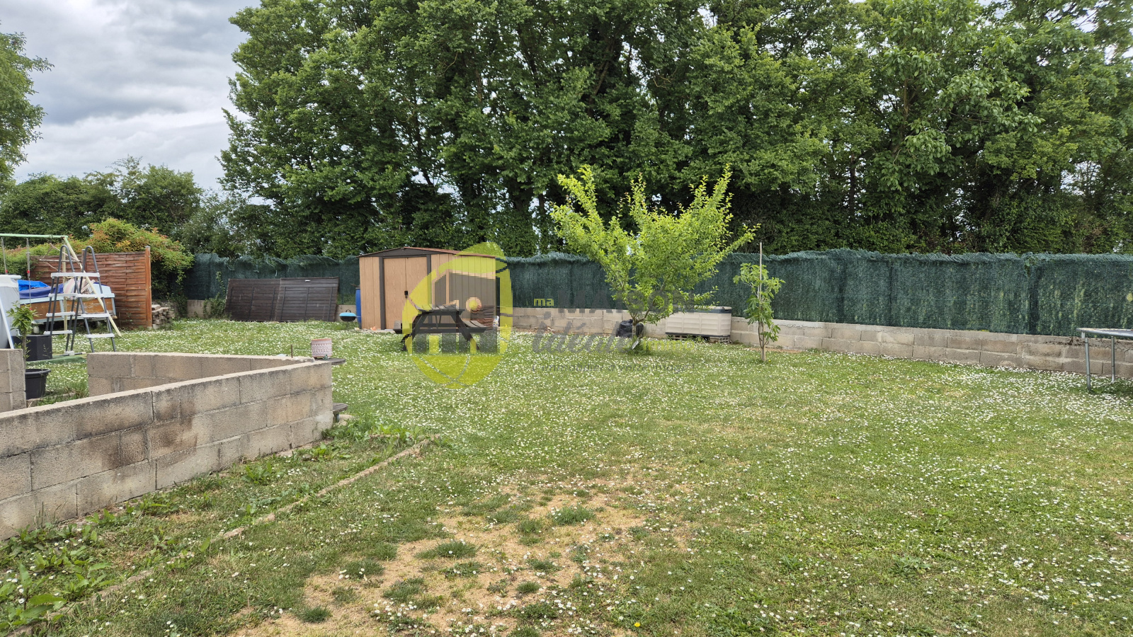 À l’extérieur, le terrain d’environ 696 m², au calme, accueille deux cabanes de jardin pratiques pour le rangement et les loisirs.